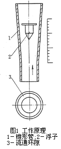 金屬轉(zhuǎn)子流量計(jì)的流量檢測(cè)元件是由一根自下向上擴(kuò)大的垂直錐形管和一個(gè)沿著錐管軸上下移動(dòng)的浮子組所組成。工作原理如圖1所示,被測(cè)流體從下向上經(jīng)過(guò)錐管1和浮子2形成的環(huán)隙3時(shí),浮子上下端產(chǎn)生差壓形成浮子上升的力,當(dāng)浮子所受上升力大于浸在流體中浮子重量時(shí),浮子便上升,環(huán)隙面積隨之增大,環(huán)隙處流體流速立即下降,浮子上下端差壓降低,作用于浮子的上升力亦隨著減少,直到上升力等于浸在流體中浮子重量時(shí),浮子便穩(wěn)定在某一高度。浮子在錐管中高度和通過(guò)的流量有對(duì)應(yīng)關(guān)系。